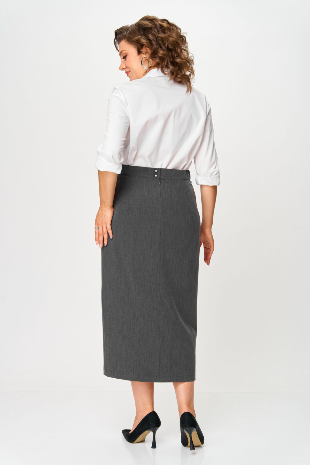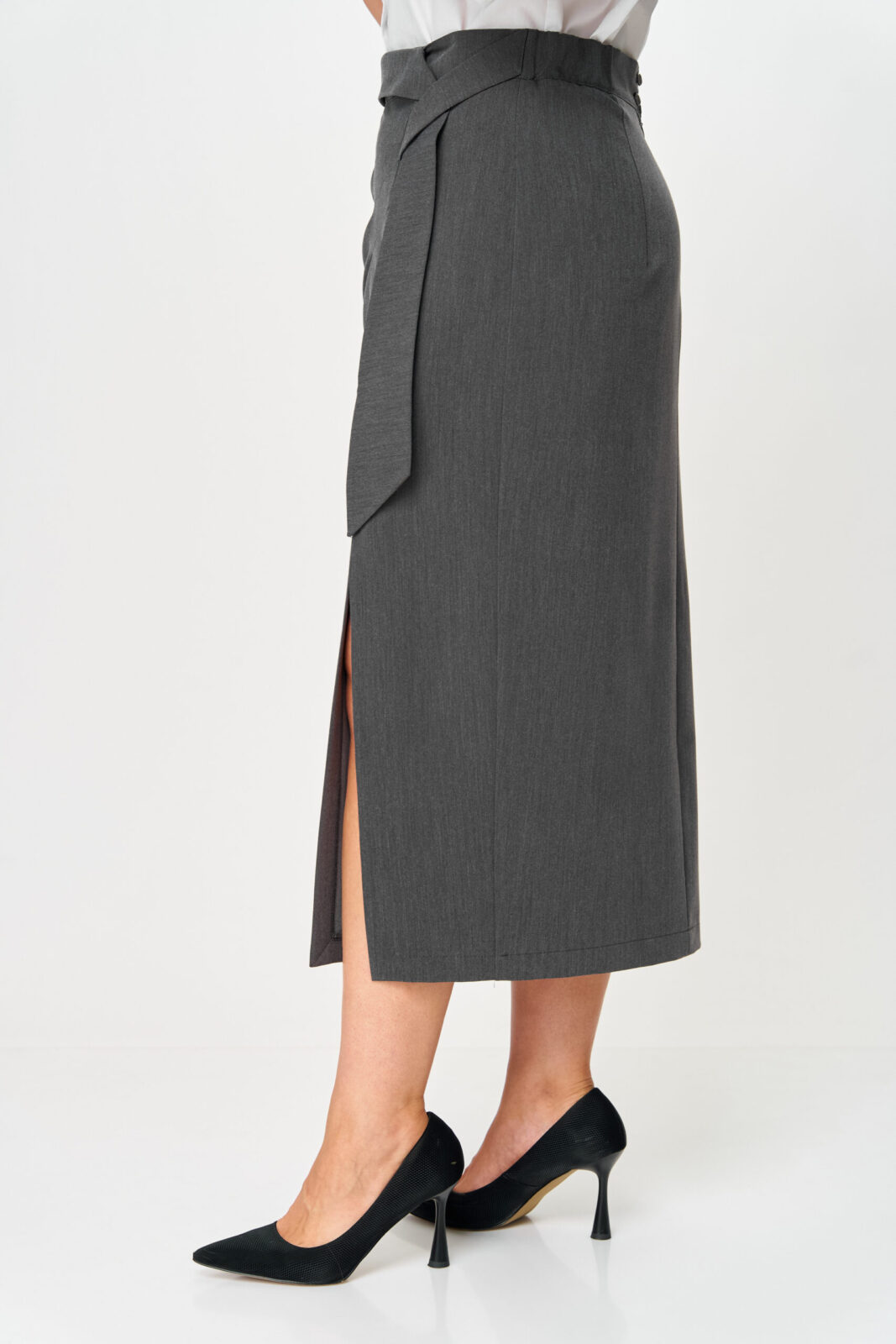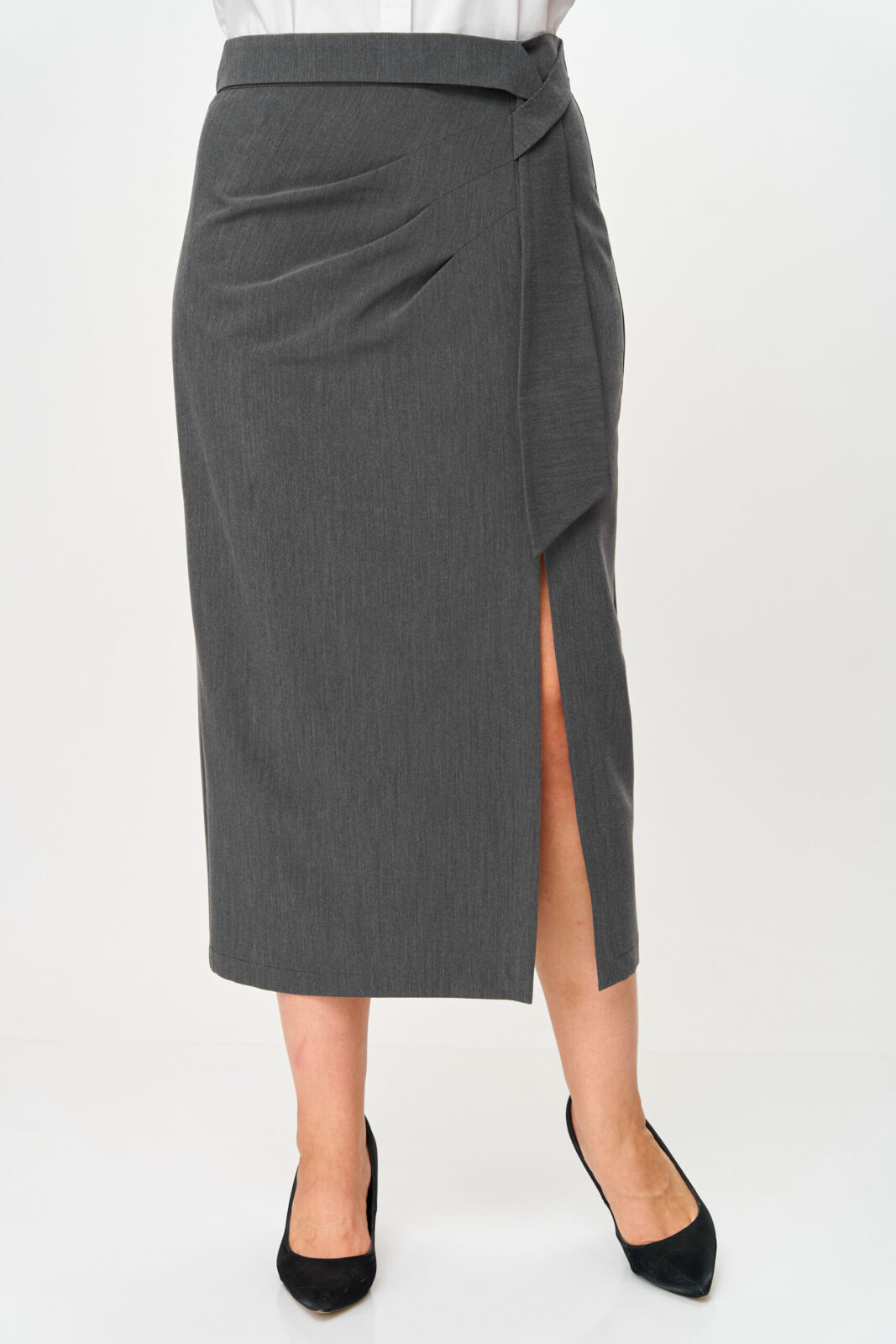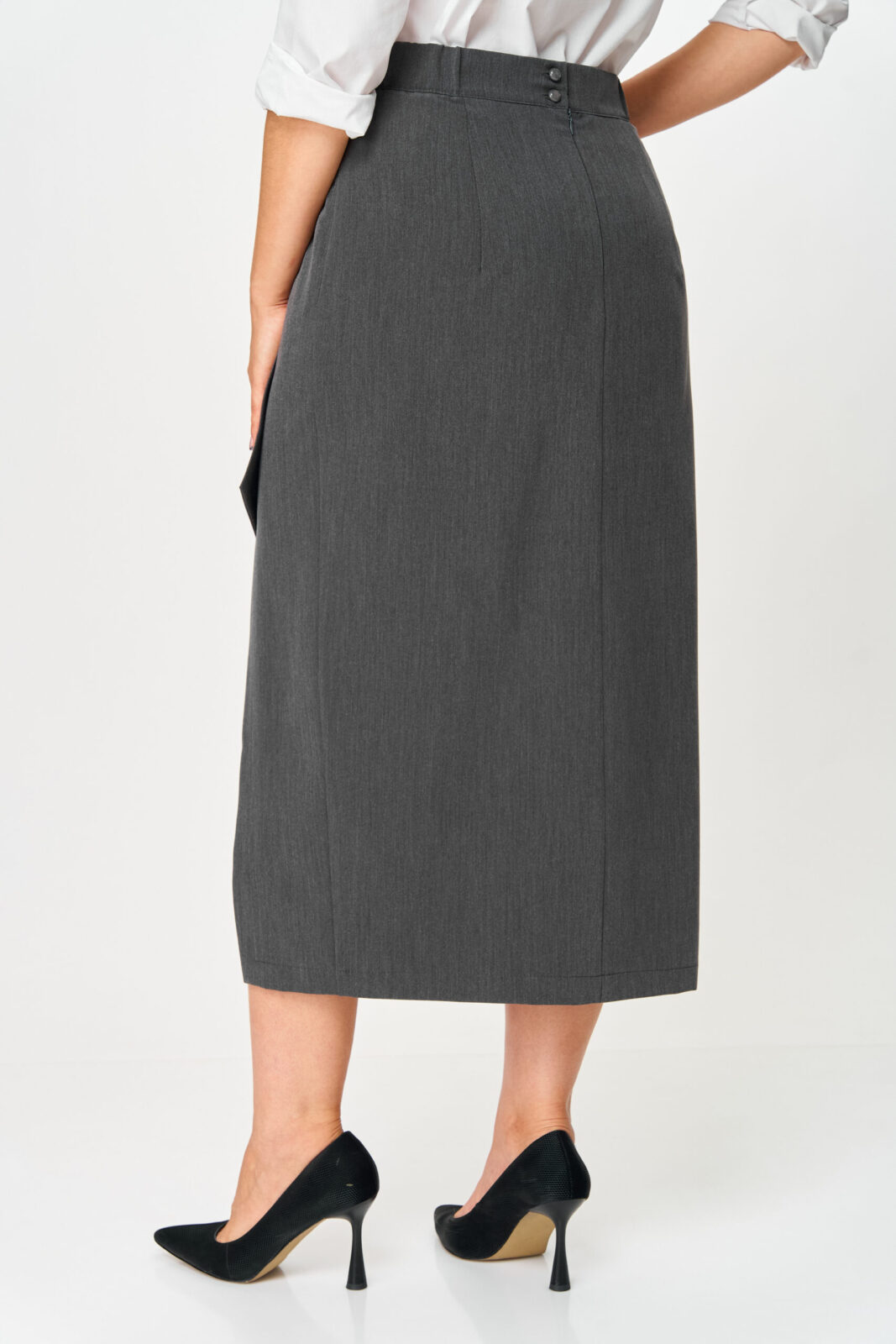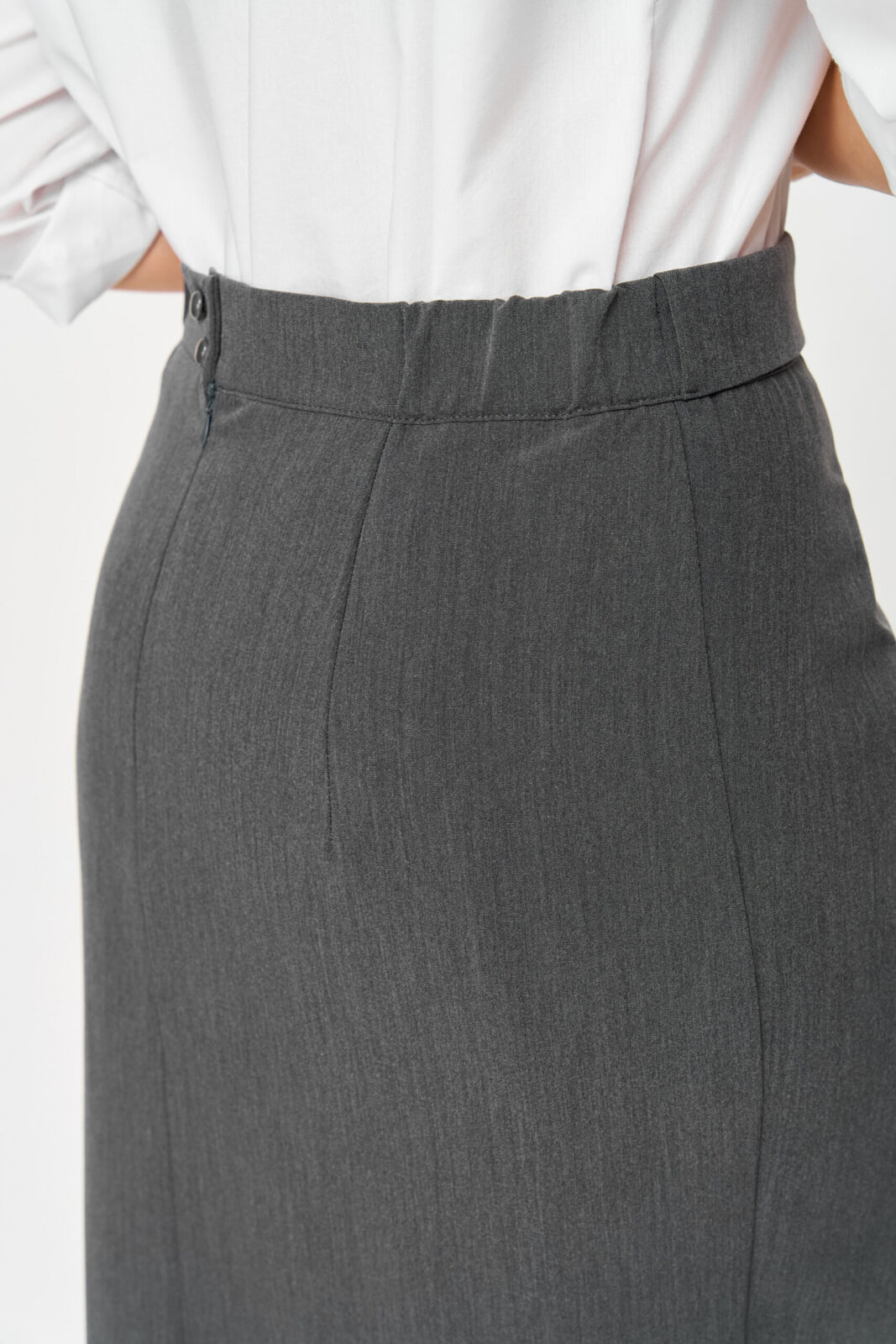Юбка мягко облегает бёдра и плавно заужается к низу, создавая вытянутый силуэт. Разрез спереди добавляет лёгкость и делает образ более динамичным, а декоративные элементы придают модели характер и уникальность.