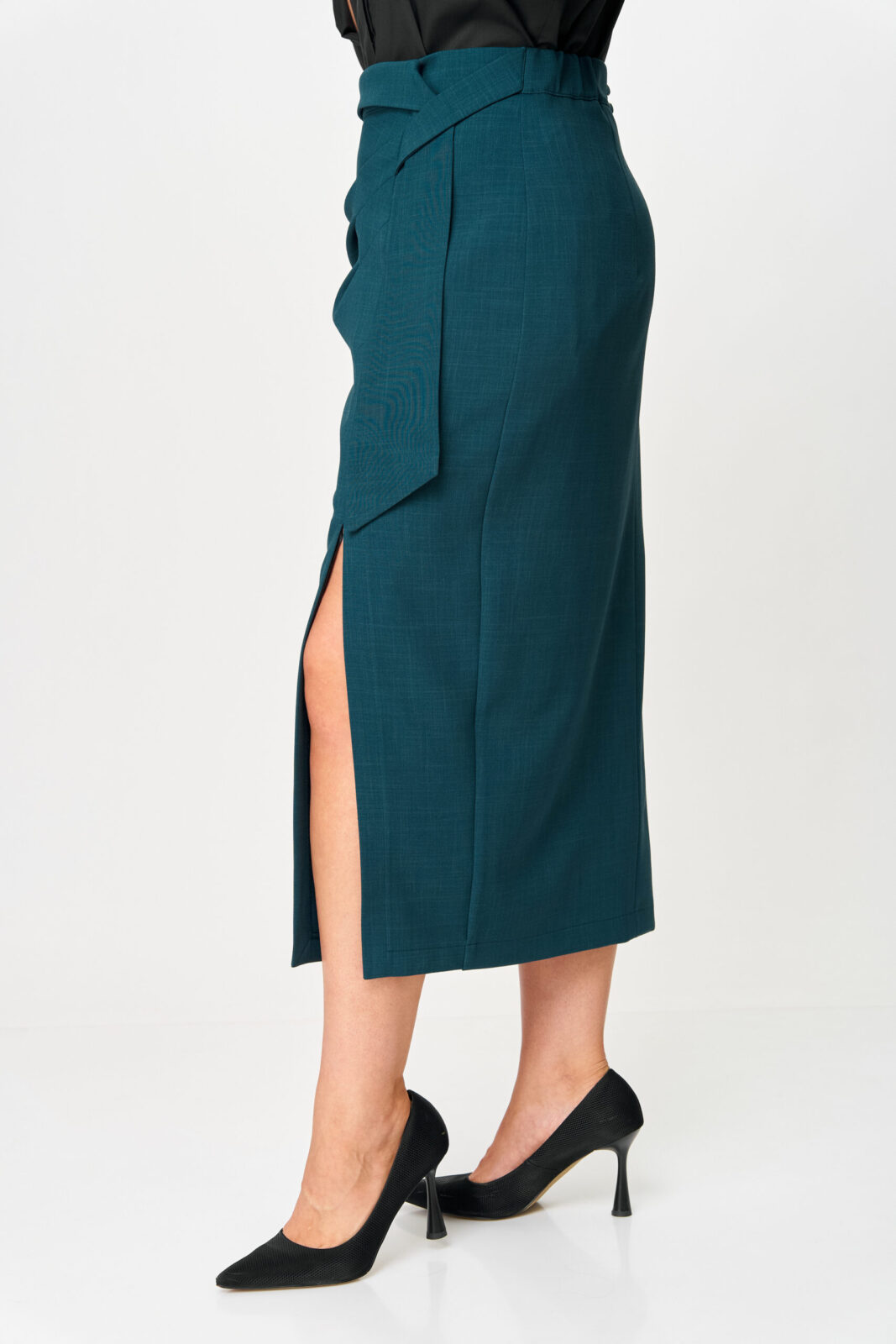 Юбка мягко облегает бёдра и плавно заужается к низу, создавая вытянутый силуэт. Разрез спереди добавляет лёгкость и делает образ более динамичным, а декоративные элементы придают модели характер и уникальность.