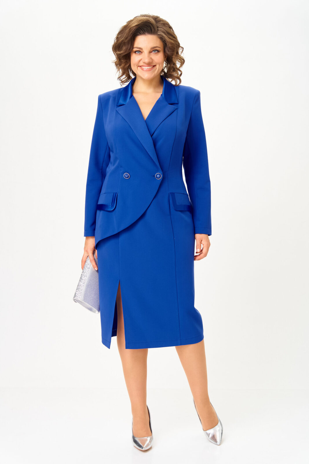 Платье полуприлегающего силуэта, длиной за колено, выполнено из однотонной ткани. В качестве отделки использована однотонная ткань с атласным эффектом. Полочка платья с вертикальными рельефами и ассиметричной отлетной правой частью, с двубортной застежкой на петли и пуговицы. По бочкам обработаны декоративные клапаны. Горловина V-образной формы с отложными лацканами и воротником . Спинка платья со средним швом и вертикальными рельефами. В левом боковом шве обработана потайная молния. В нижней части полочки, с правой стороны в рельефе обработан разрез. Рукав втачной, двухшовный, длинный. Платье на плечиках.